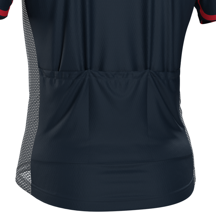 The Men's Houston Football Short Sleeve Cycling Jersey features a moisture-wicking LEMBO 140 GSM polyester, cooling 110GSM mesh side panels, and reinforced stitched back pockets.