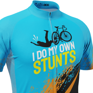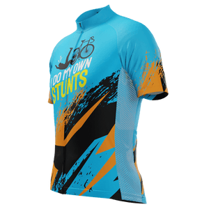 The Men's I Do My Own Stunts Short Sleeve Cycling Jersey features a moisture-wicking LEMBO 140 GSM polyester, cooling 110GSM mesh side panels, and reinforced stitched back pockets.