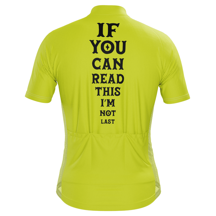The Men's If You Can Read This I'm Not Last Short Sleeve Cycling Jersey features a moisture-wicking LEMBO 140 GSM polyester, cooling 110GSM mesh side panels, and reinforced stitched back pockets.
