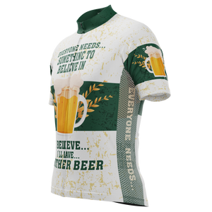The Men's I'll Have Another Beer Short Sleeve Cycling Jersey features a moisture-wicking LEMBO 140 GSM polyester, cooling 110GSM mesh side panels, and reinforced stitched back pockets.