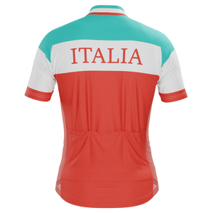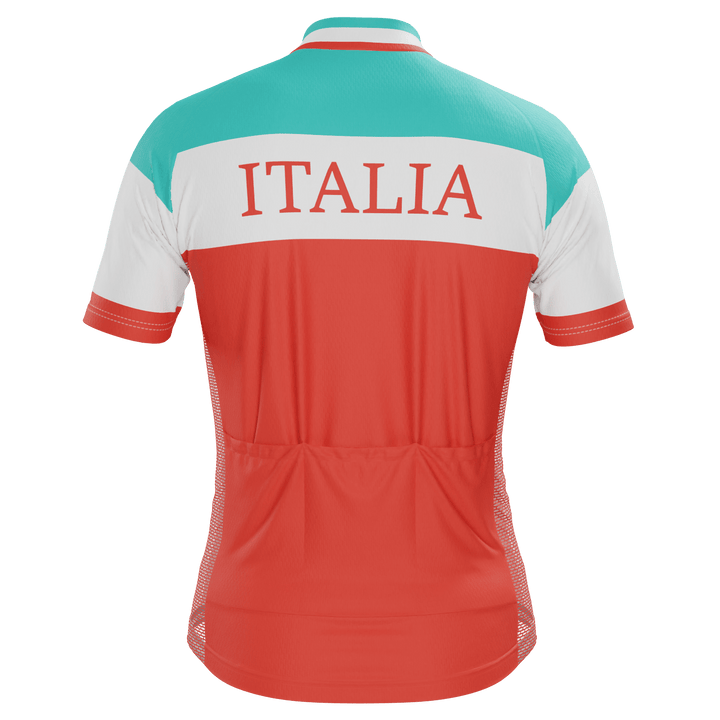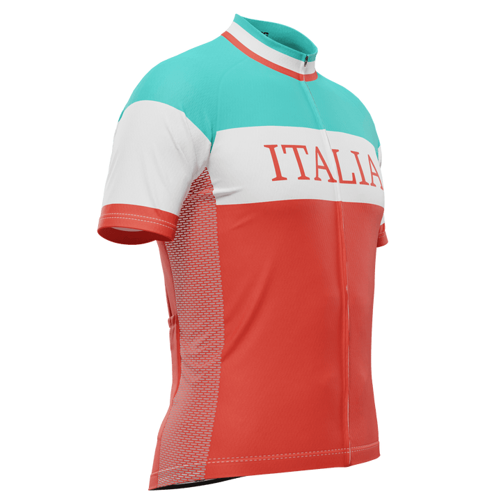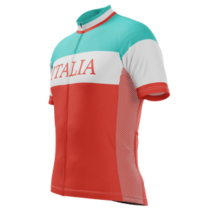 The Men's Italia Flag Pro Short Sleeve Cycling Jersey features a moisture-wicking LEMBO 140 GSM polyester, cooling 110GSM mesh side panels, and reinforced stitched back pockets.