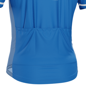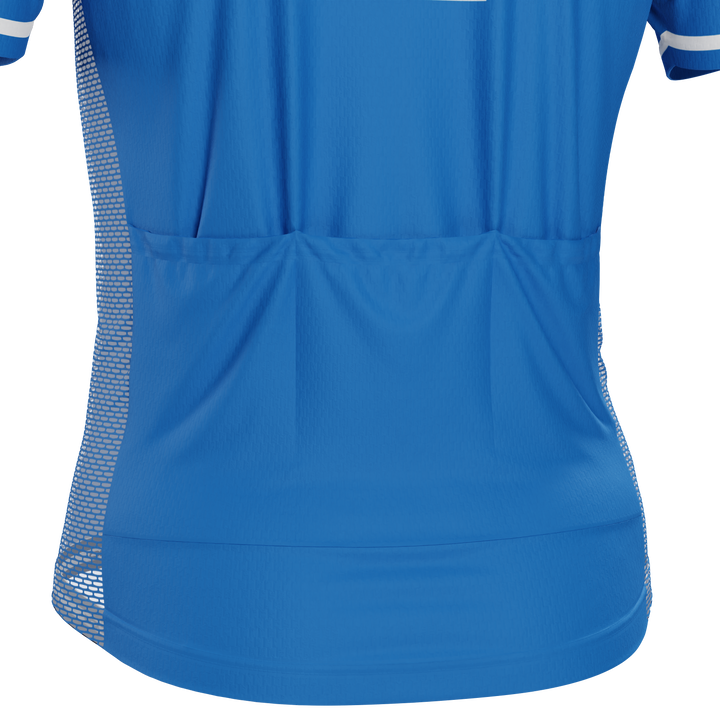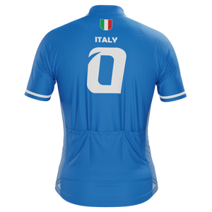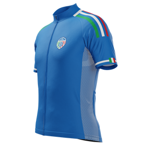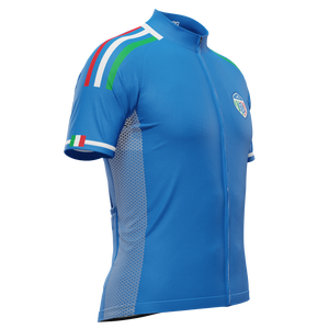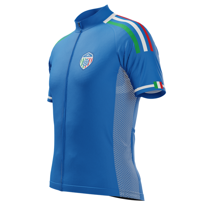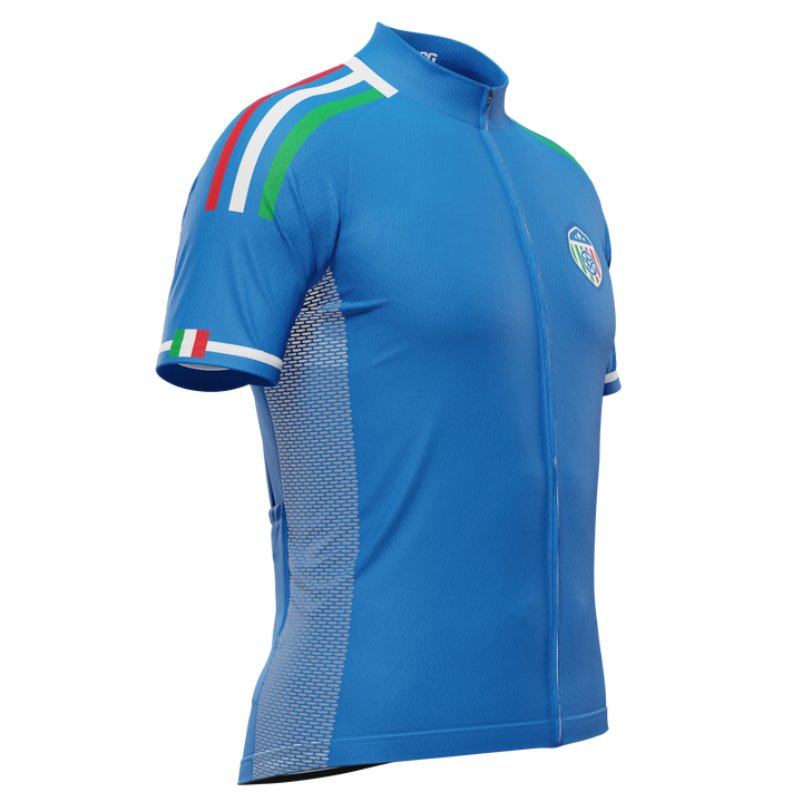The Men's Italy Soccer Short Sleeve Cycling Jersey features a moisture-wicking LEMBO 140 GSM polyester, cooling 110GSM mesh side panels, and reinforced stitched back pockets.