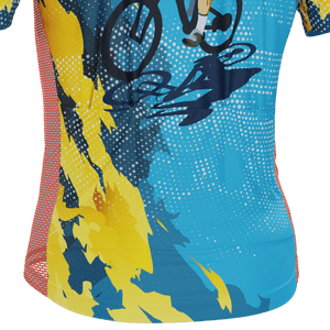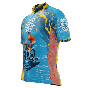 The Men's Just Wanna Ride Short Sleeve Cycling Jersey features a moisture-wicking LEMBO 140 GSM polyester, cooling 110GSM mesh side panels, and reinforced stitched back pockets.