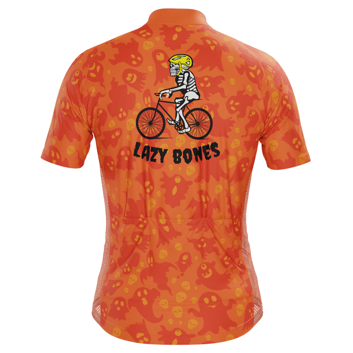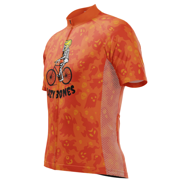 The Men's Lazy Bones Short Sleeve Cycling Jersey features a moisture-wicking LEMBO 140 GSM polyester, cooling 110GSM mesh side panels, and reinforced stitched back pockets.