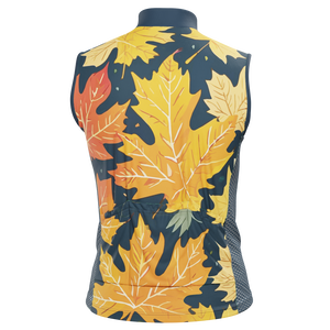 The Men's Leaves in the Fall Sleeveless Cycling Jersey features a moisture-wicking LEMBO 140 GSM polyester, cooling 110GSM mesh side panels, and reinforced stitched back pockets.