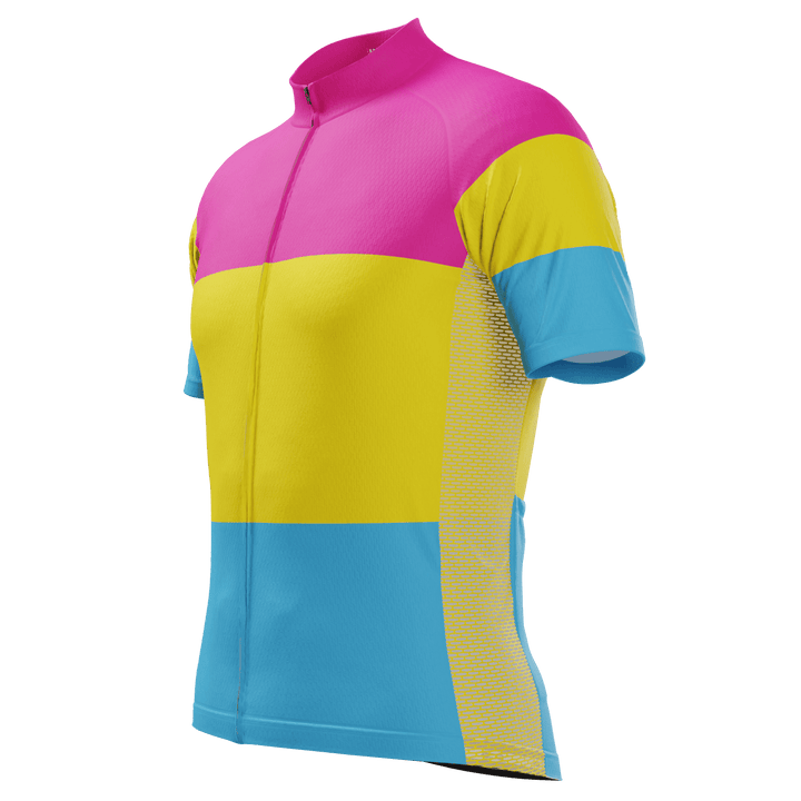 The Men's LGBT Pansexual Pride Short Sleeve Cycling Jersey features a moisture-wicking LEMBO 140 GSM polyester, cooling 110GSM mesh side panels, and reinforced stitched back pockets.