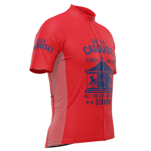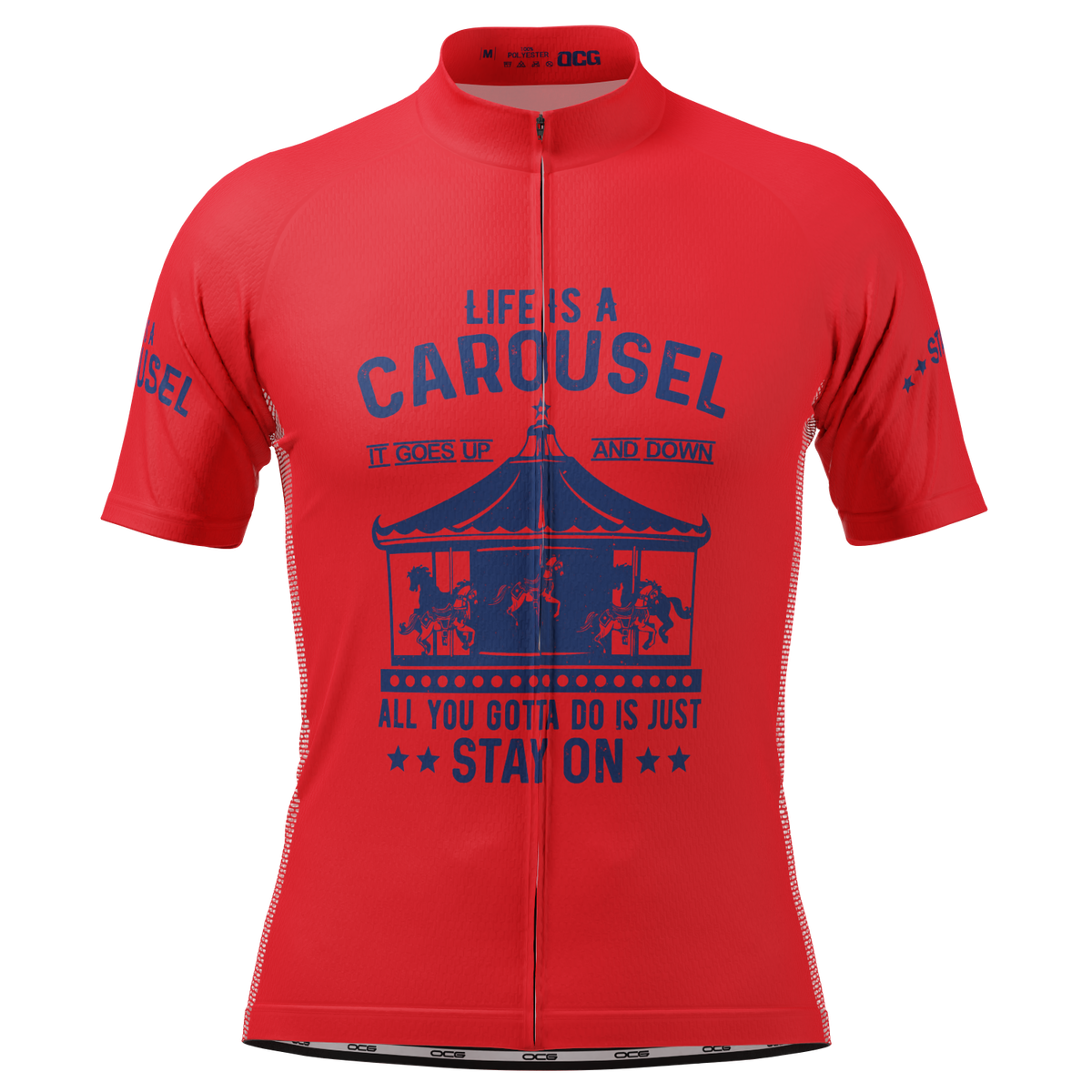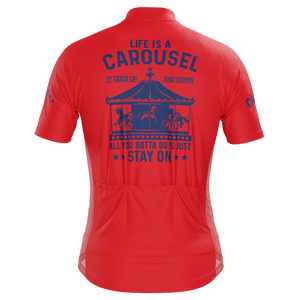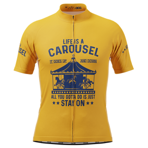 The Men's Life Is Like A Carousel Short Sleeve Cycling Jersey features a moisture-wicking LEMBO 140 GSM polyester, cooling 110GSM mesh side panels, and reinforced stitched back pockets.