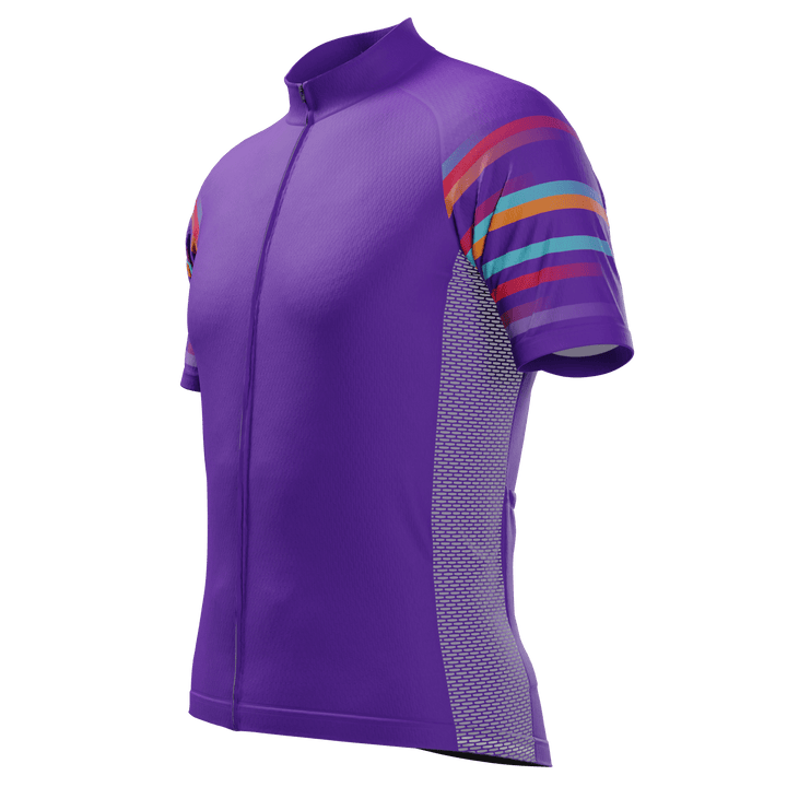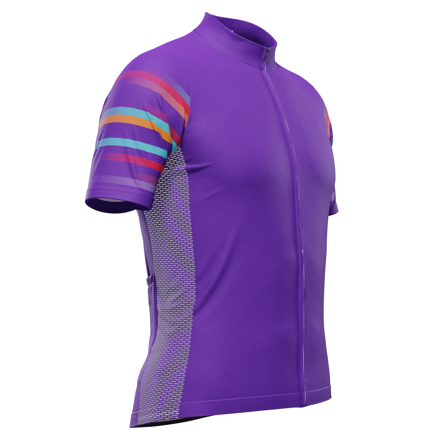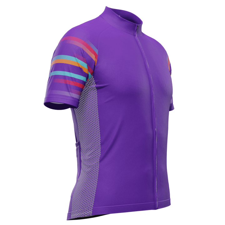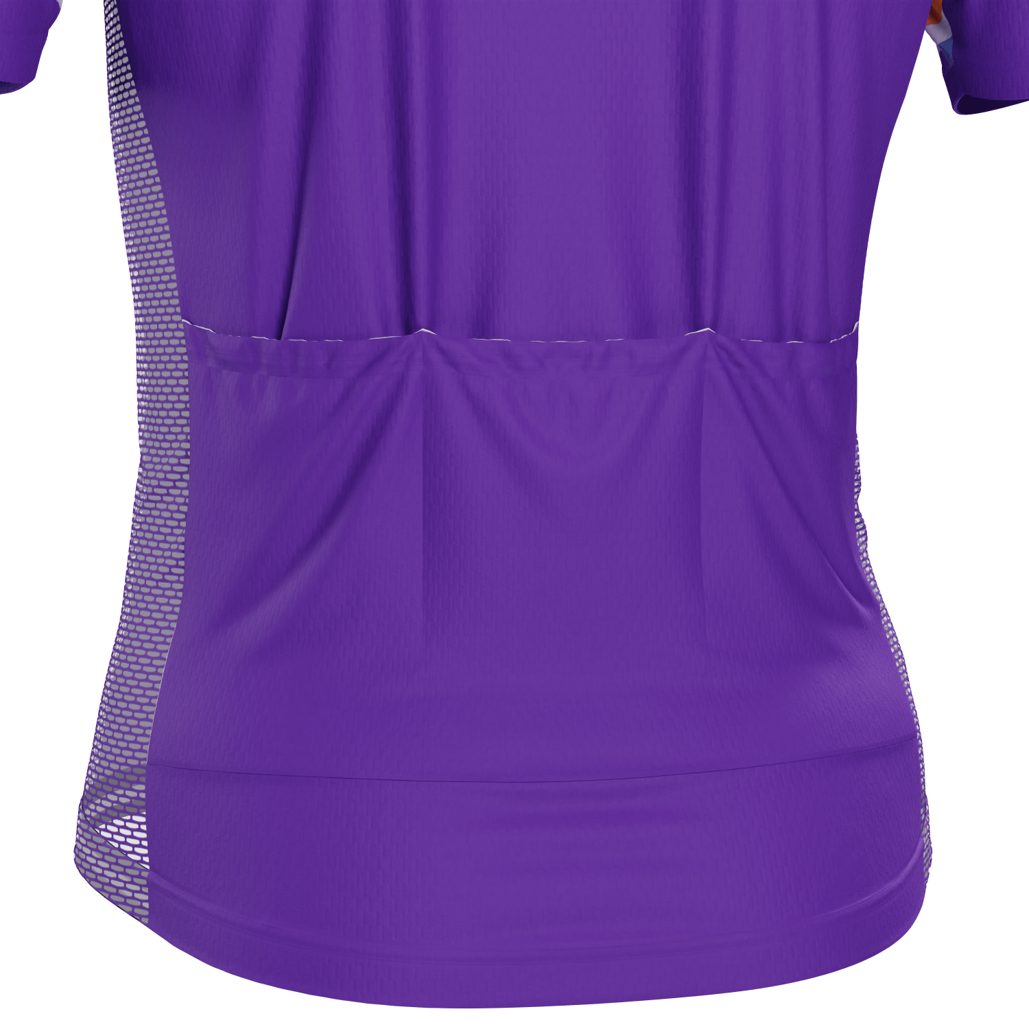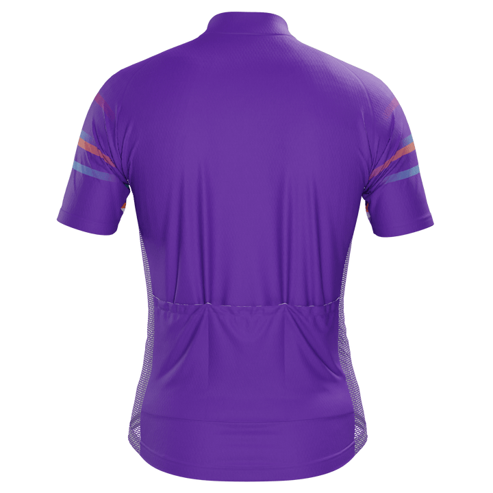 The Men's Linear Short Sleeve Cycling Jersey features a moisture-wicking LEMBO 140 GSM polyester, cooling 110GSM mesh side panels, and reinforced stitched back pockets.