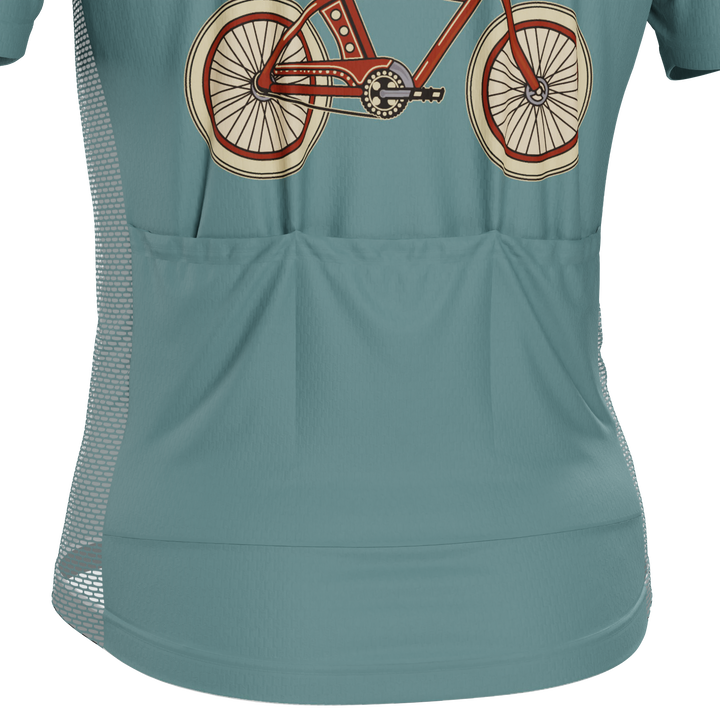 The Men's Live, Love, Ride, Retro Short Sleeve Cycling Jersey features a moisture-wicking LEMBO 140 GSM polyester, cooling 110GSM mesh side panels, and reinforced stitched back pockets.