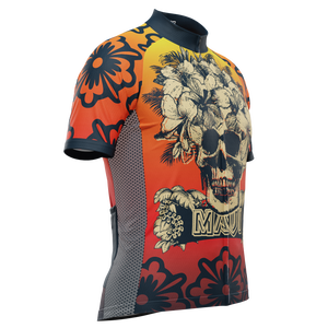 The Men's Maui Skull Short Sleeve Cycling Jersey features a moisture-wicking LEMBO 140 GSM polyester, cooling 110GSM mesh side panels, and reinforced stitched back pockets.