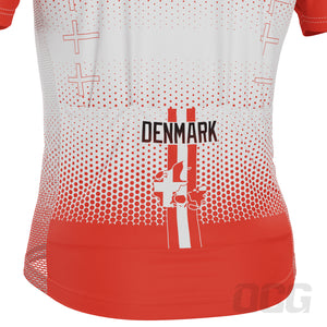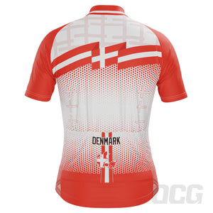 The Men's World Countries Flag Denmark Short Sleeve Cycling Jersey features a moisture-wicking LEMBO 140 GSM polyester, cooling 110GSM mesh side panels, and reinforced stitched back pockets.