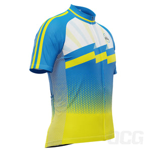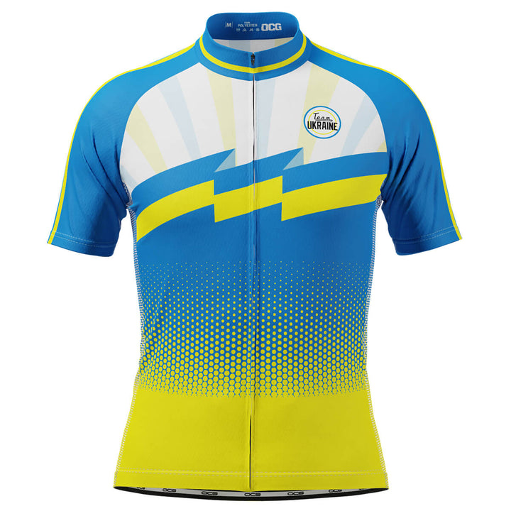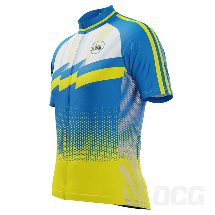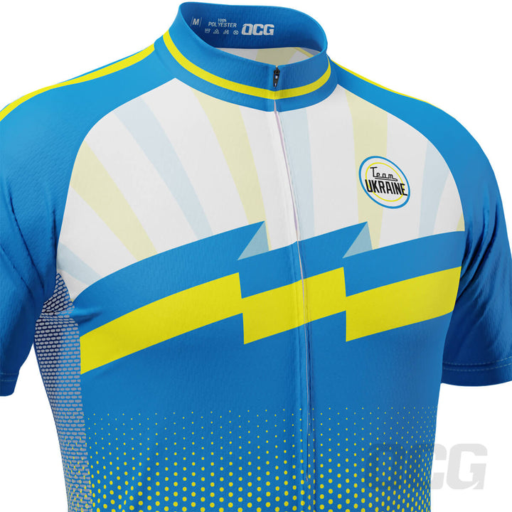 The Men's World Countries Flags Ukraine Short Sleeve Cycling Jersey features a moisture-wicking LEMBO 140 GSM polyester, cooling 110GSM mesh side panels, and reinforced stitched back pockets.