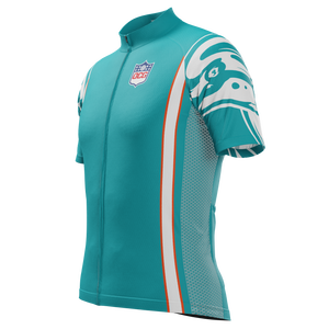 The Men's Miami Football Short Sleeve Cycling Jersey features a moisture-wicking LEMBO 140 GSM polyester, cooling 110GSM mesh side panels, and reinforced stitched back pockets.