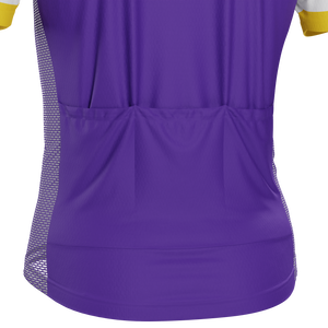 The Men's Minnesota Football Short Sleeve Cycling Jersey features a moisture-wicking LEMBO 140 GSM polyester, cooling 110GSM mesh side panels, and reinforced stitched back pockets.