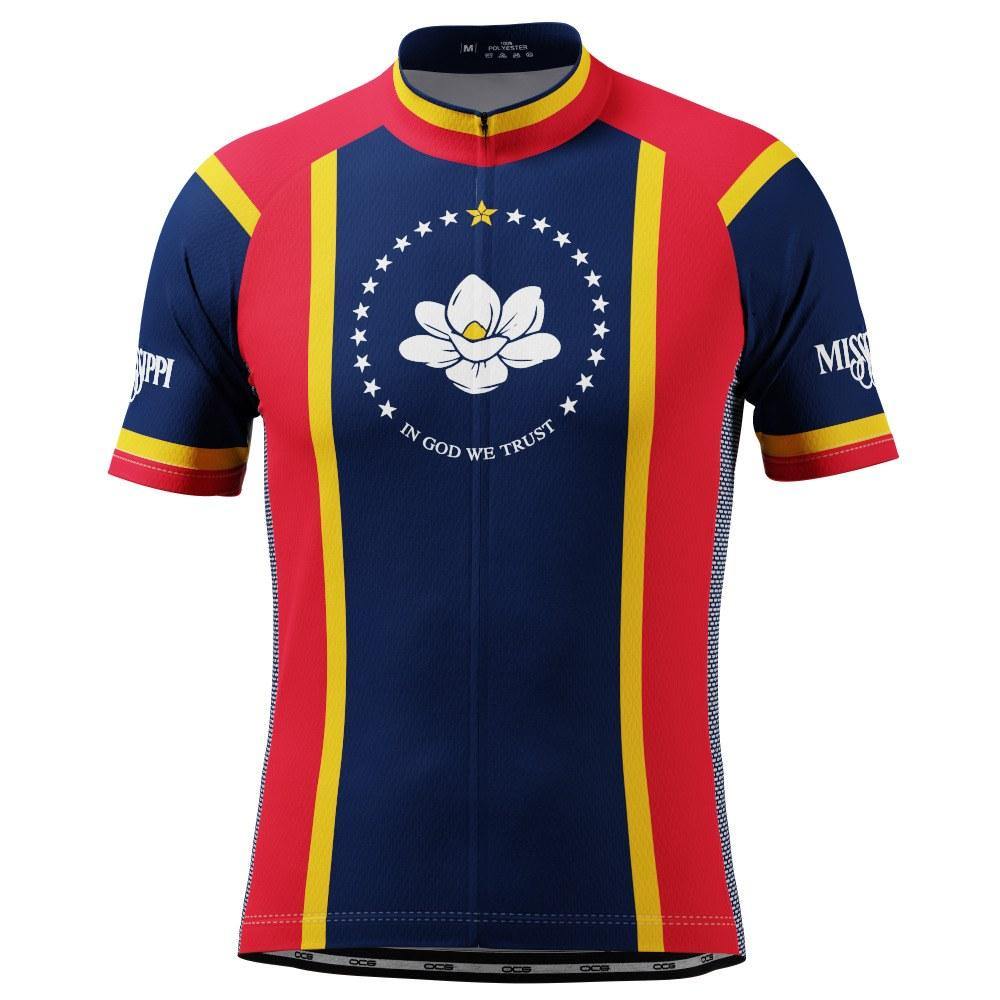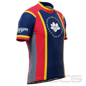 The Men's Mississippi State Flag Short Sleeve Cycling Jersey features a moisture-wicking LEMBO 140 GSM polyester, cooling 110GSM mesh side panels, and reinforced stitched back pockets.