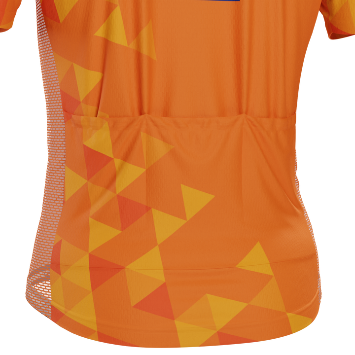 The Men's Netherlands Soccer Short Sleeve Cycling Jersey features a moisture-wicking LEMBO 140 GSM polyester, cooling 110GSM mesh side panels, and reinforced stitched back pockets.