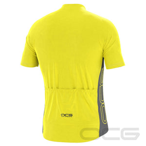 The Men's OCG High Viz Neon Short Sleeve Cycling Jersey features a moisture-wicking LEMBO 140 GSM polyester, cooling 110GSM mesh side panels, and reinforced stitched back pockets.