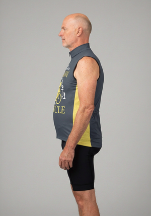 The Men's Old Man Bicycle Sleeveless Cycling Jersey features a moisture-wicking LEMBO 140 GSM polyester, cooling 110GSM mesh side panels, and reinforced stitched back pockets to go with the cooling sleeveless design.
