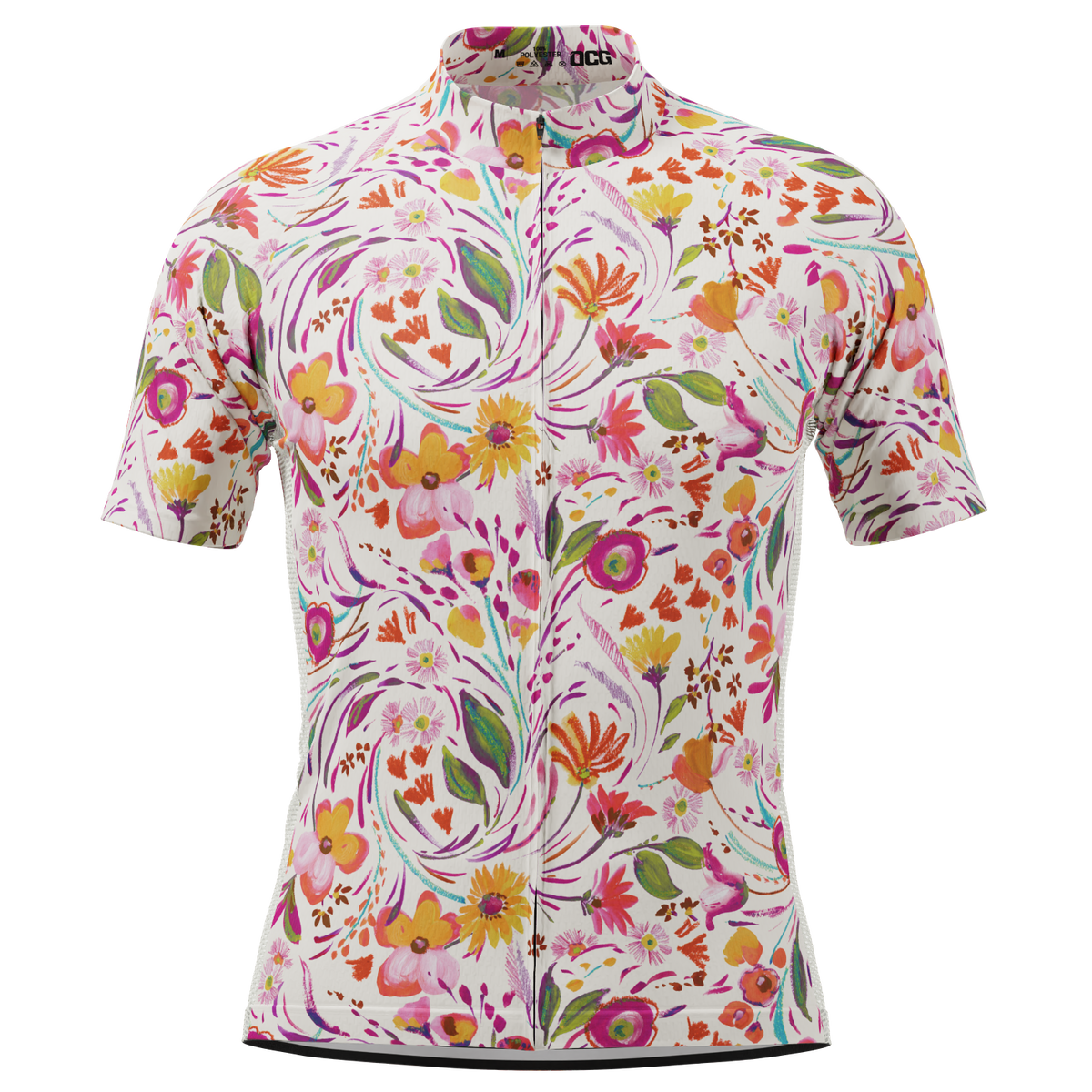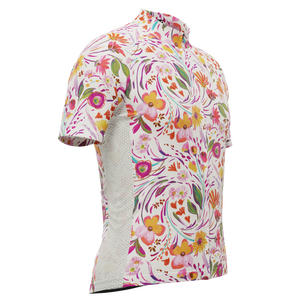 The Men's Painterly Blooms Short Sleeve Cycling Jersey features a moisture-wicking LEMBO 140 GSM polyester, cooling 110GSM mesh side panels, and reinforced stitched back pockets.