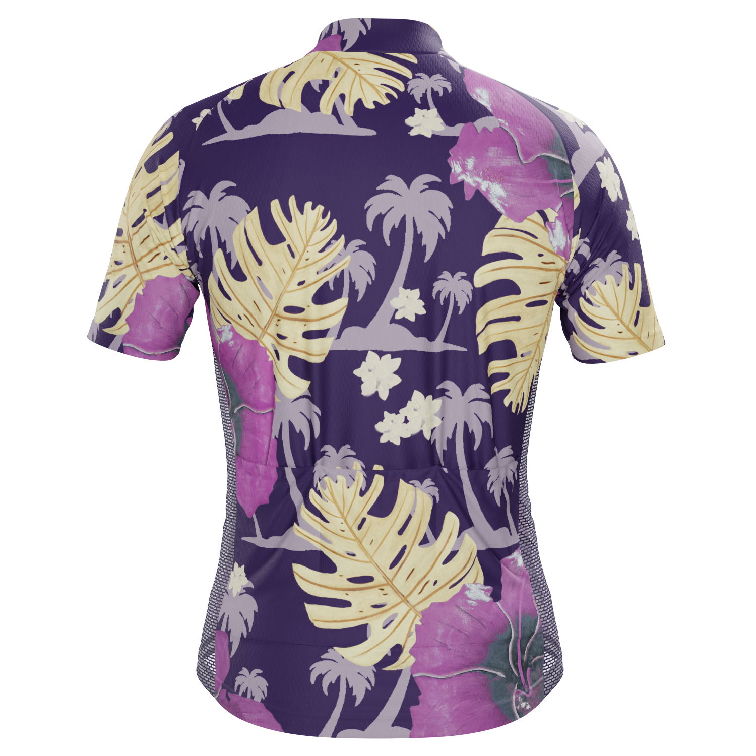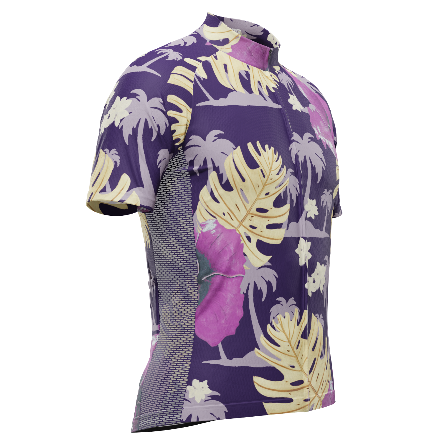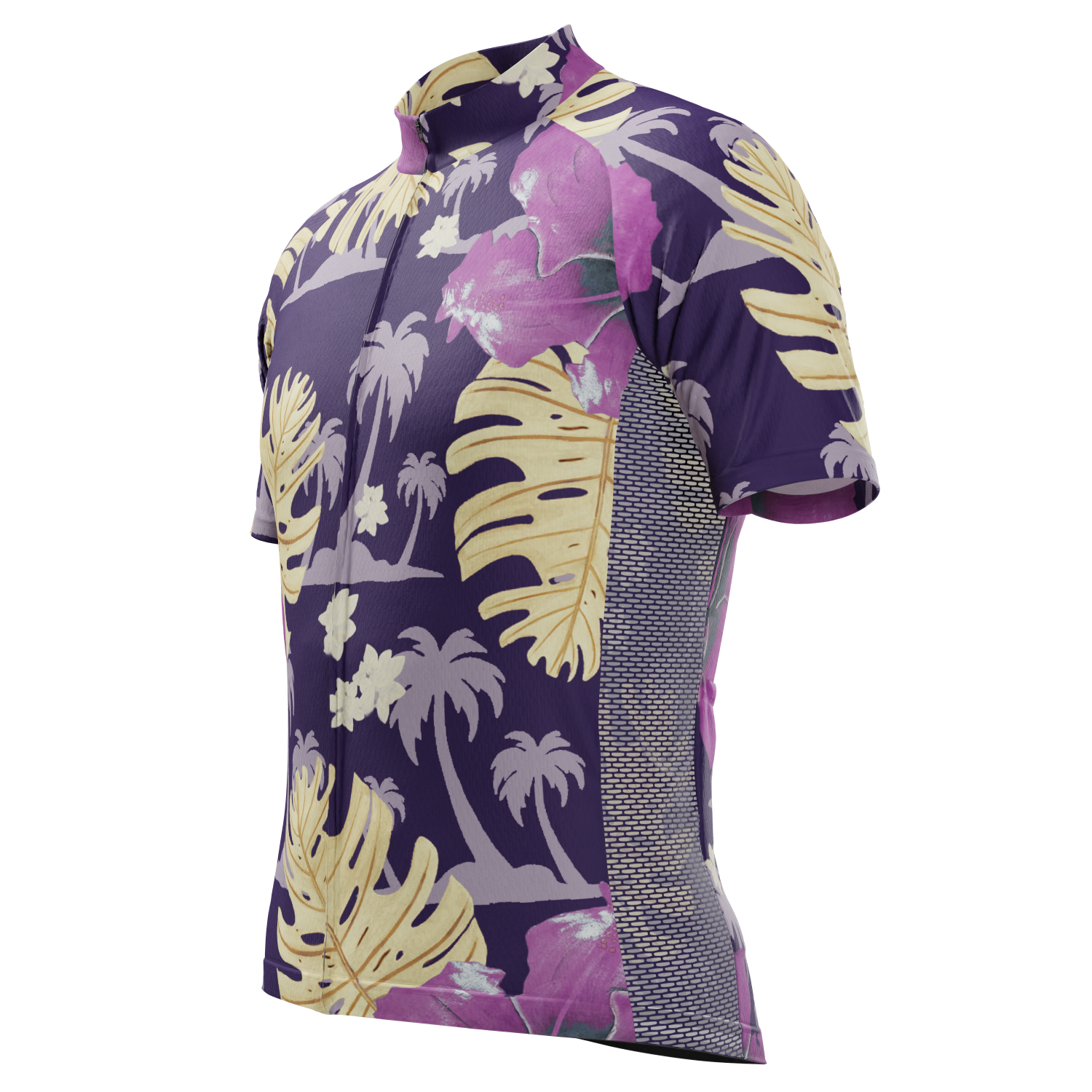 The Men's Palmtree Leaves Short Sleeve Cycling Jersey features a moisture-wicking LEMBO 140 GSM polyester, cooling 110GSM mesh side panels, and reinforced stitched back pockets.