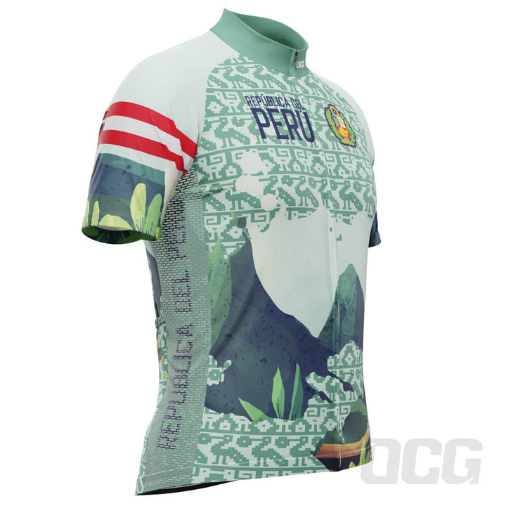 The Men's Peru Flag Caral Pyramids Short Sleeve Cycling Jersey features a moisture-wicking LEMBO 140 GSM polyester, cooling 110GSM mesh side panels, and reinforced stitched back pockets.