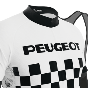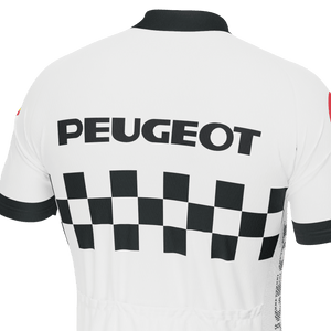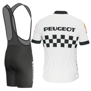 The Men's Peugeot Shell Retro 1983 Short Sleeve Cycling Kit features a moisture-wicking LEMBO 140 GSM polyester jersey body, cooling 110GSM mesh side panels, and reinforced stitched back pockets.