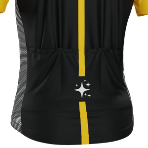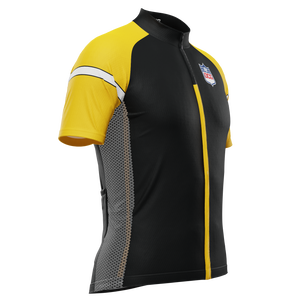 The Men's Pittsburg Football Short Sleeve Cycling Jersey features a moisture-wicking LEMBO 140 GSM polyester, cooling 110GSM mesh side panels, and reinforced stitched back pockets.