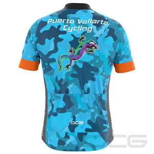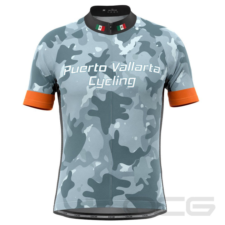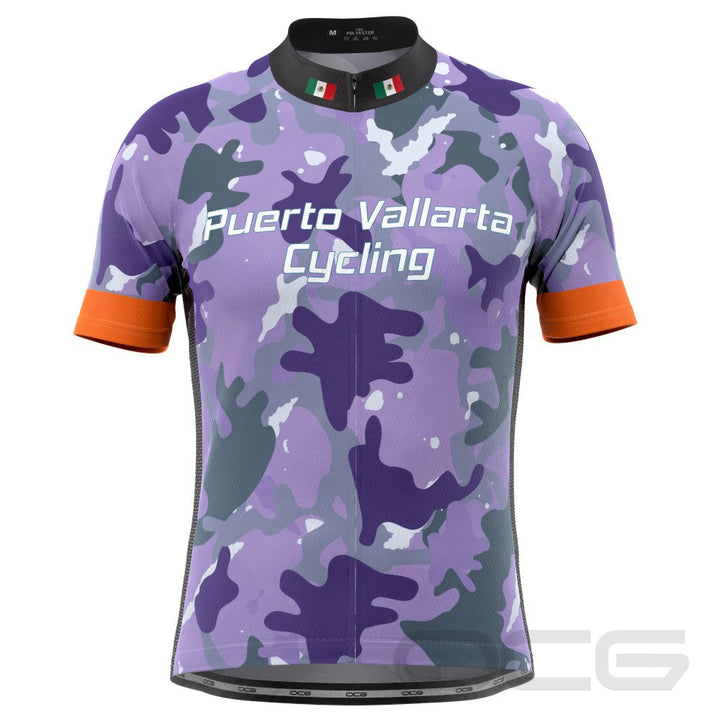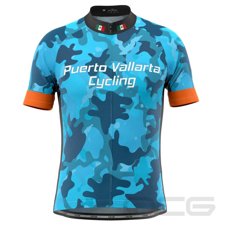 The Men's Puerto Vallarta Camo Short Sleeve Cycling Jersey features a moisture-wicking LEMBO 140 GSM polyester, cooling 110GSM mesh side panels, and reinforced stitched back pockets.