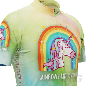 The Men's Rainbows and Unicorns Short Sleeve Cycling Jersey features a moisture-wicking LEMBO 140 GSM polyester, cooling 110GSM mesh side panels, and reinforced stitched back pockets.