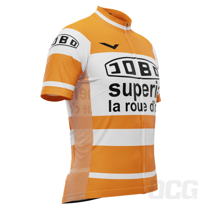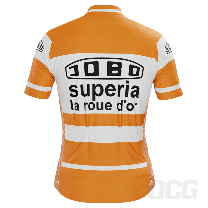 The Men's Retro 1978 Jobo Superia Short Sleeve Cycling Jersey features a moisture-wicking LEMBO 140 GSM polyester, cooling 110GSM mesh side panels, and reinforced stitched back pockets.