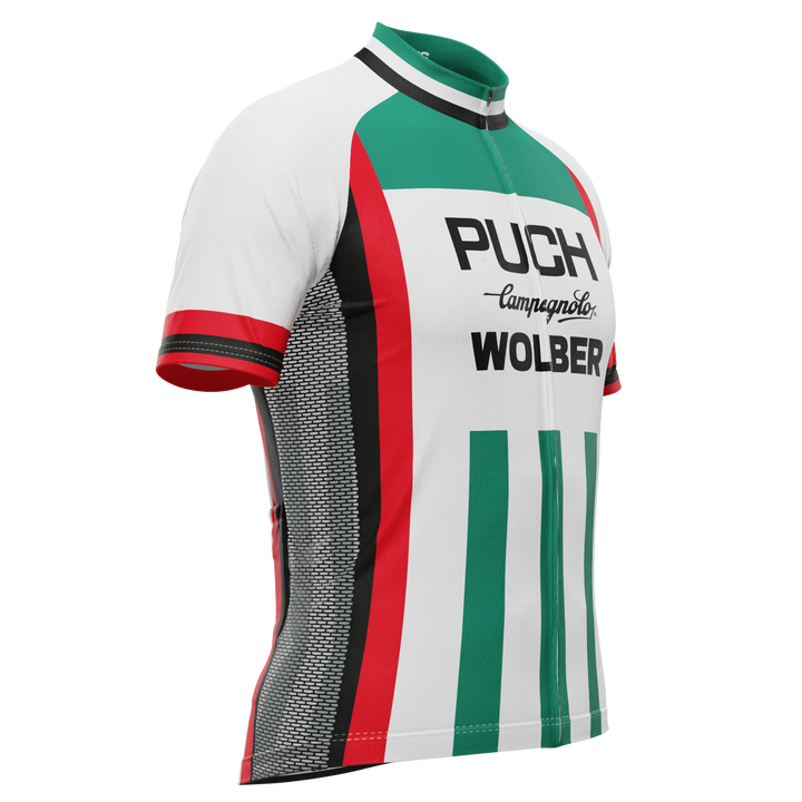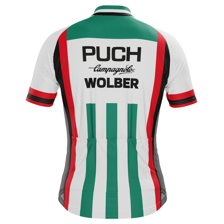 The Men's Retro 1981 Puch Campagnolo Wolber Short Sleeve Cycling Jersey features a moisture-wicking LEMBO 140 GSM polyester, cooling 110GSM mesh side panels, and reinforced stitched back pockets.