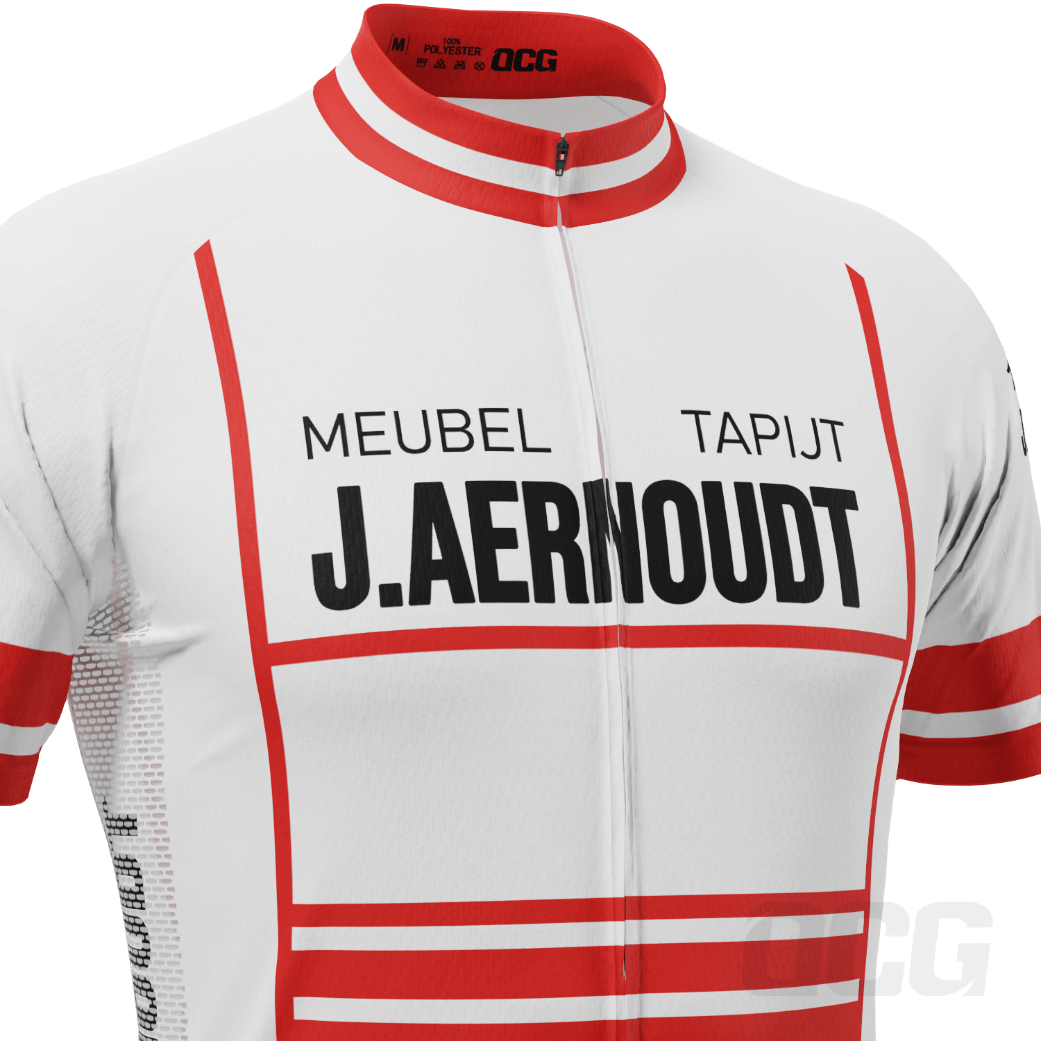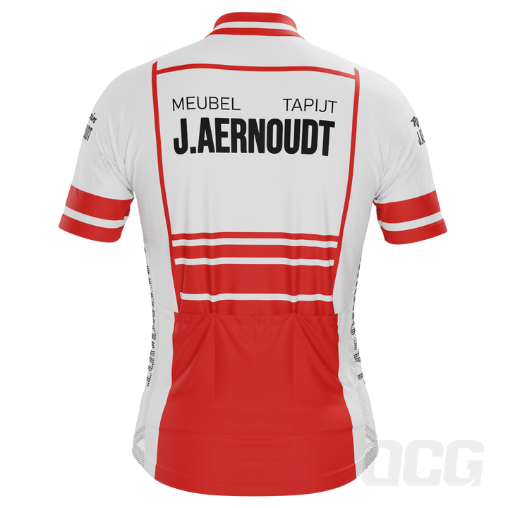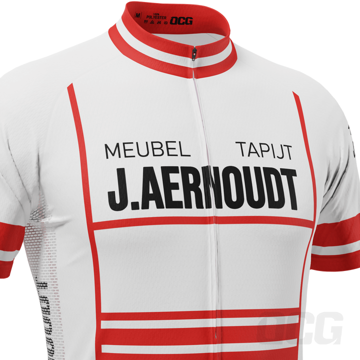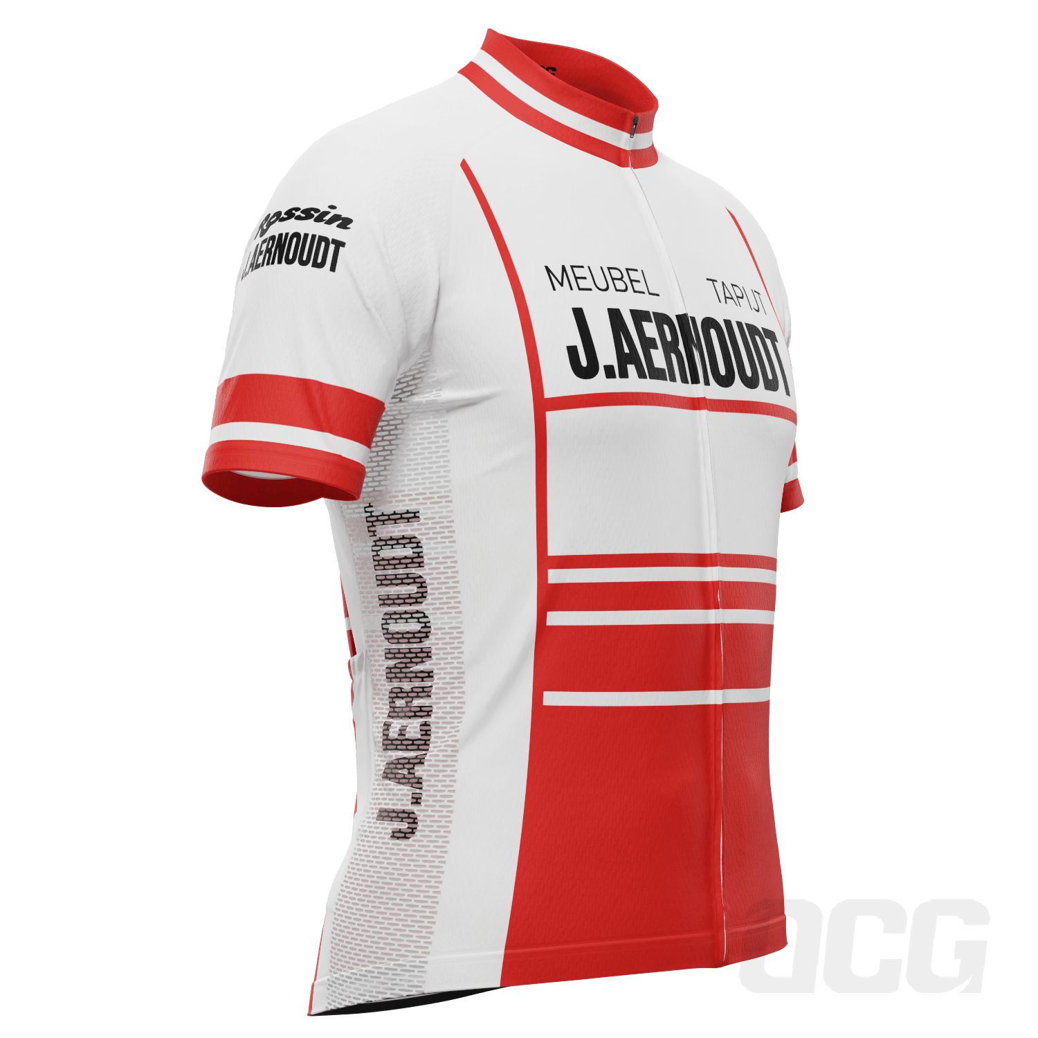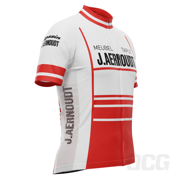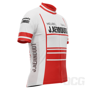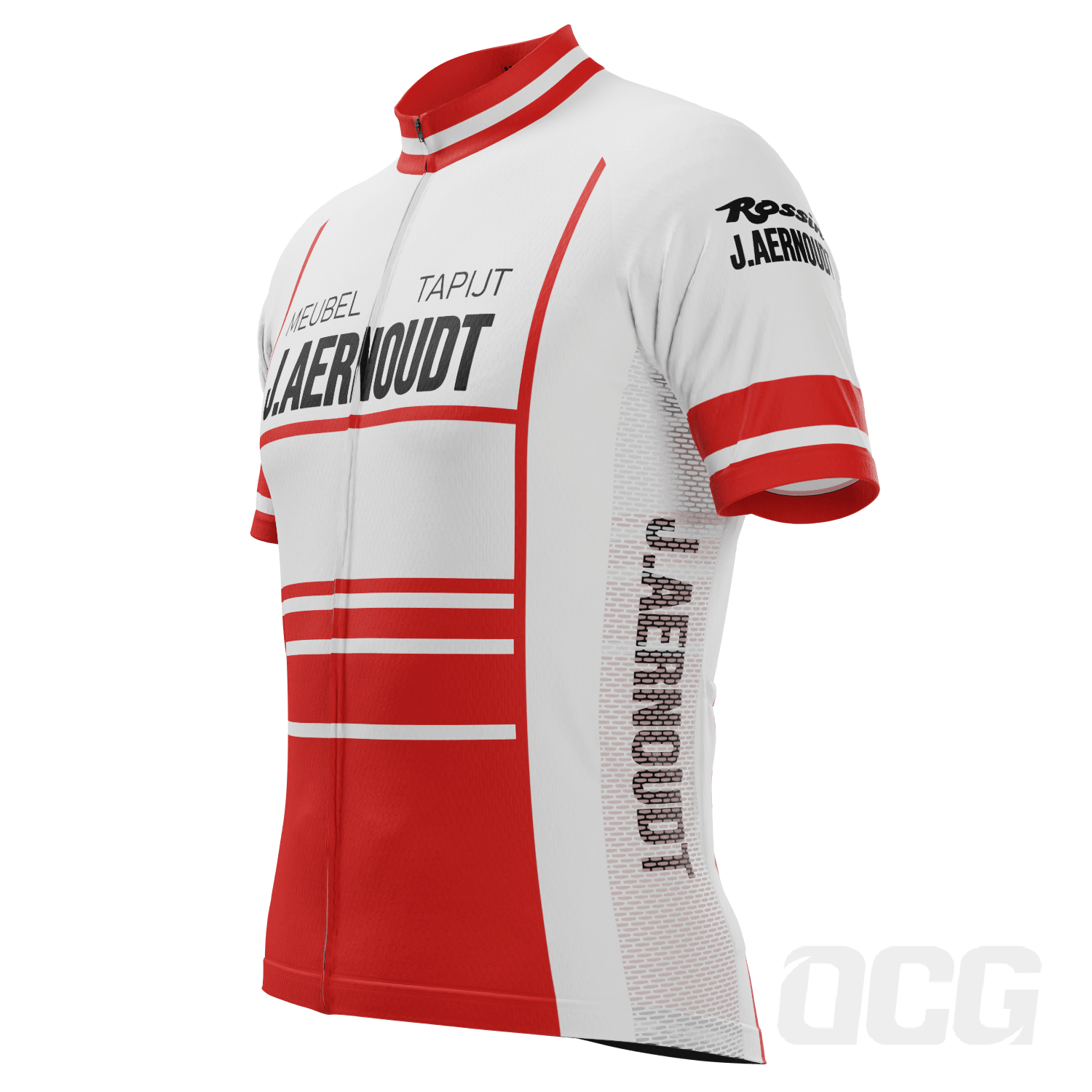 The Men's Retro 1983 Jacky Aernoudt Rosin Short Sleeve Cycling Jersey features a moisture-wicking LEMBO 140 GSM polyester, cooling 110GSM mesh side panels, and reinforced stitched back pockets.