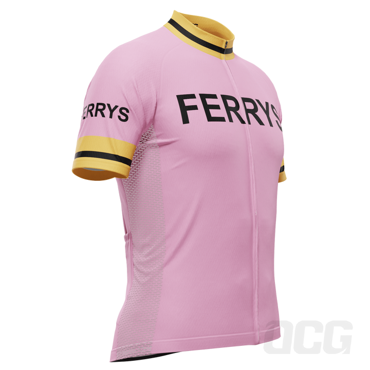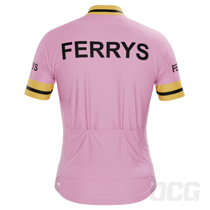 The Men's Retro Ferrys 1960's Pink Short Sleeve Cycling Jersey features a moisture-wicking LEMBO 140 GSM polyester, cooling 110GSM mesh side panels, and reinforced stitched back pockets.