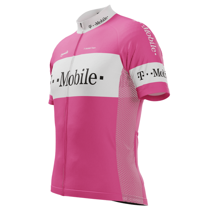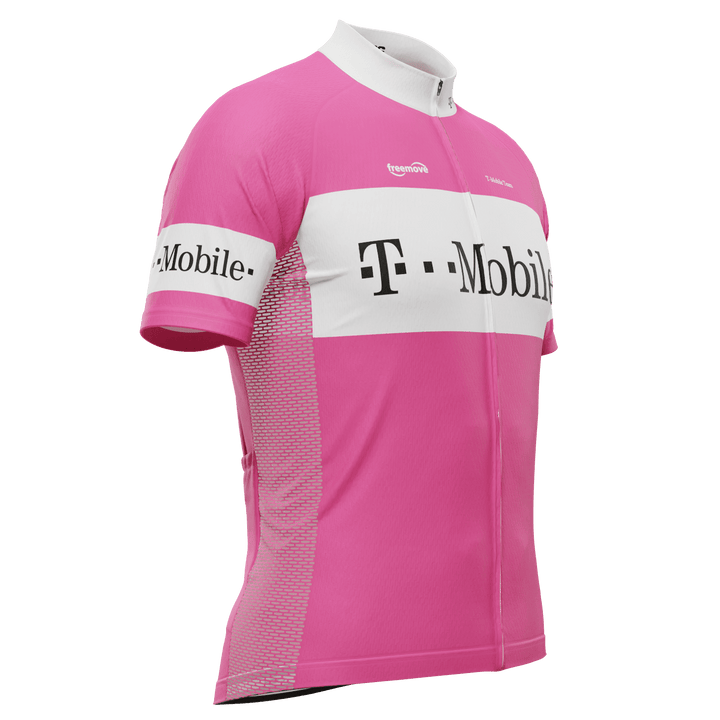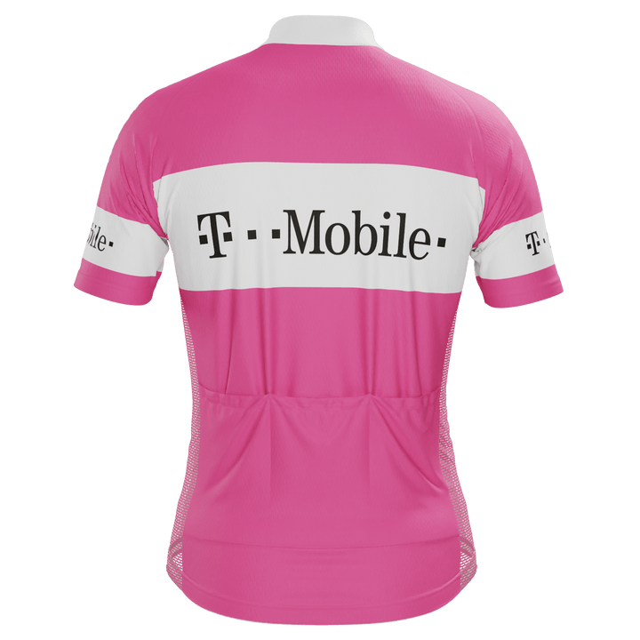 The Men's Retro T-Mobile Short Sleeve Cycling Jersey features a moisture-wicking LEMBO 140 GSM polyester, cooling 110GSM mesh side panels, and reinforced stitched back pockets.