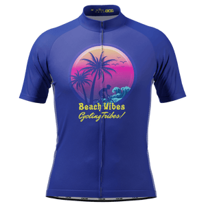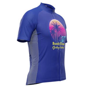 The Men's Retrowave Sunset Short Sleeve Cycling Jersey features a moisture-wicking LEMBO 140 GSM polyester, cooling 110GSM mesh side panels, and reinforced stitched back pockets.