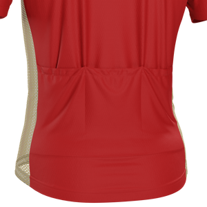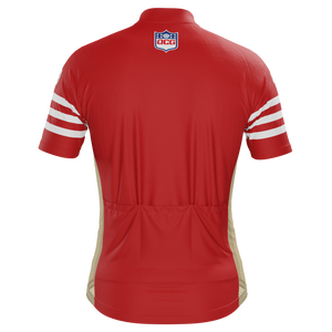 The Men's San Francisco Football Short Sleeve Cycling Jersey features a moisture-wicking LEMBO 140 GSM polyester, cooling 110GSM mesh side panels, and reinforced stitched back pockets.
