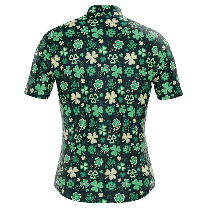 The Men's Shamrocks & Clovers Short Sleeve Cycling Jersey features a moisture-wicking LEMBO 140 GSM polyester, cooling 110GSM mesh side panels, and reinforced stitched back pockets.