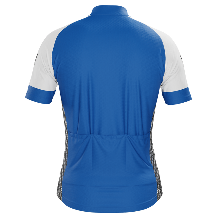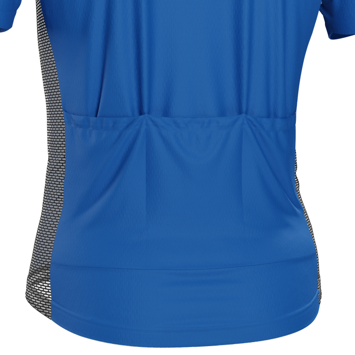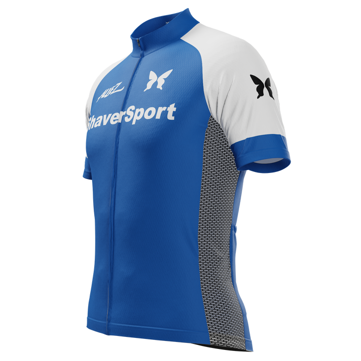 The Men's Shaversport Short Sleeve Cycling Jersey features a moisture-wicking LEMBO 140 GSM polyester, cooling 110GSM mesh side panels, and reinforced stitched back pockets.