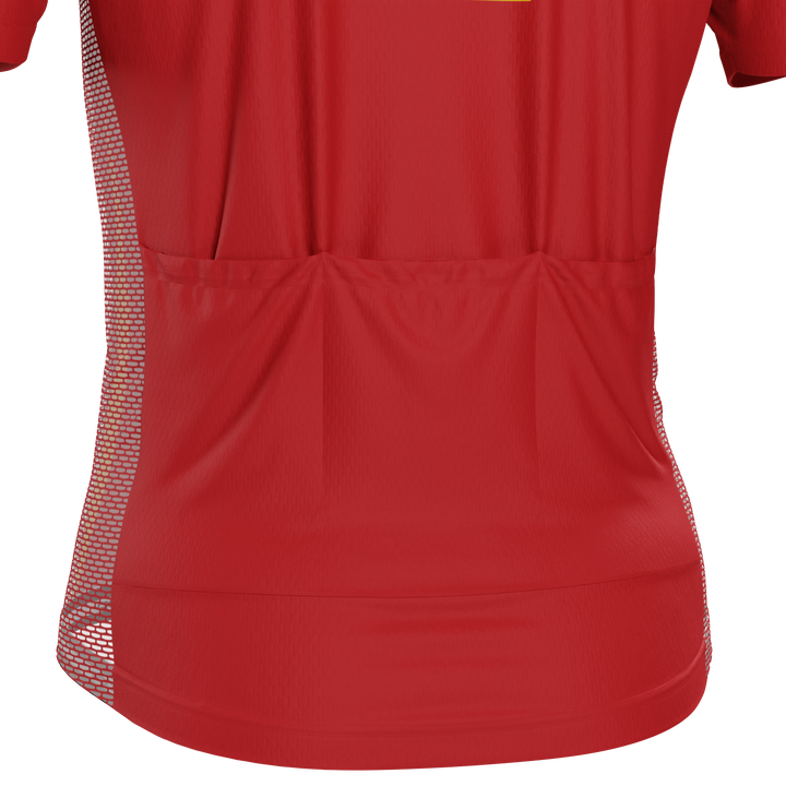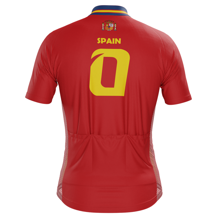 The Men's Spain Soccer Short Sleeve Cycling Jersey features a moisture-wicking LEMBO 140 GSM polyester, cooling 110GSM mesh side panels, and reinforced stitched back pockets.