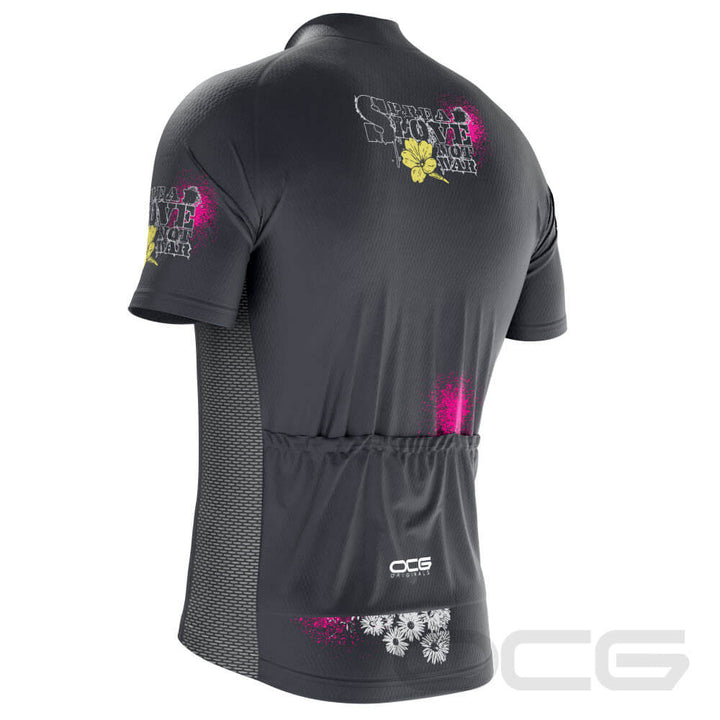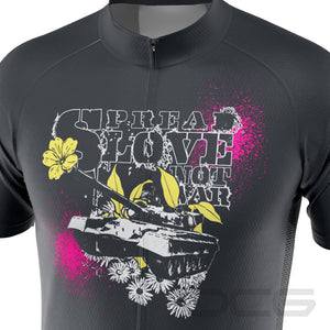 The Men's Spread Love Not War Short Sleeve Cycling Jersey features a moisture-wicking LEMBO 140 GSM polyester, cooling 110GSM mesh side panels, and reinforced stitched back pockets.