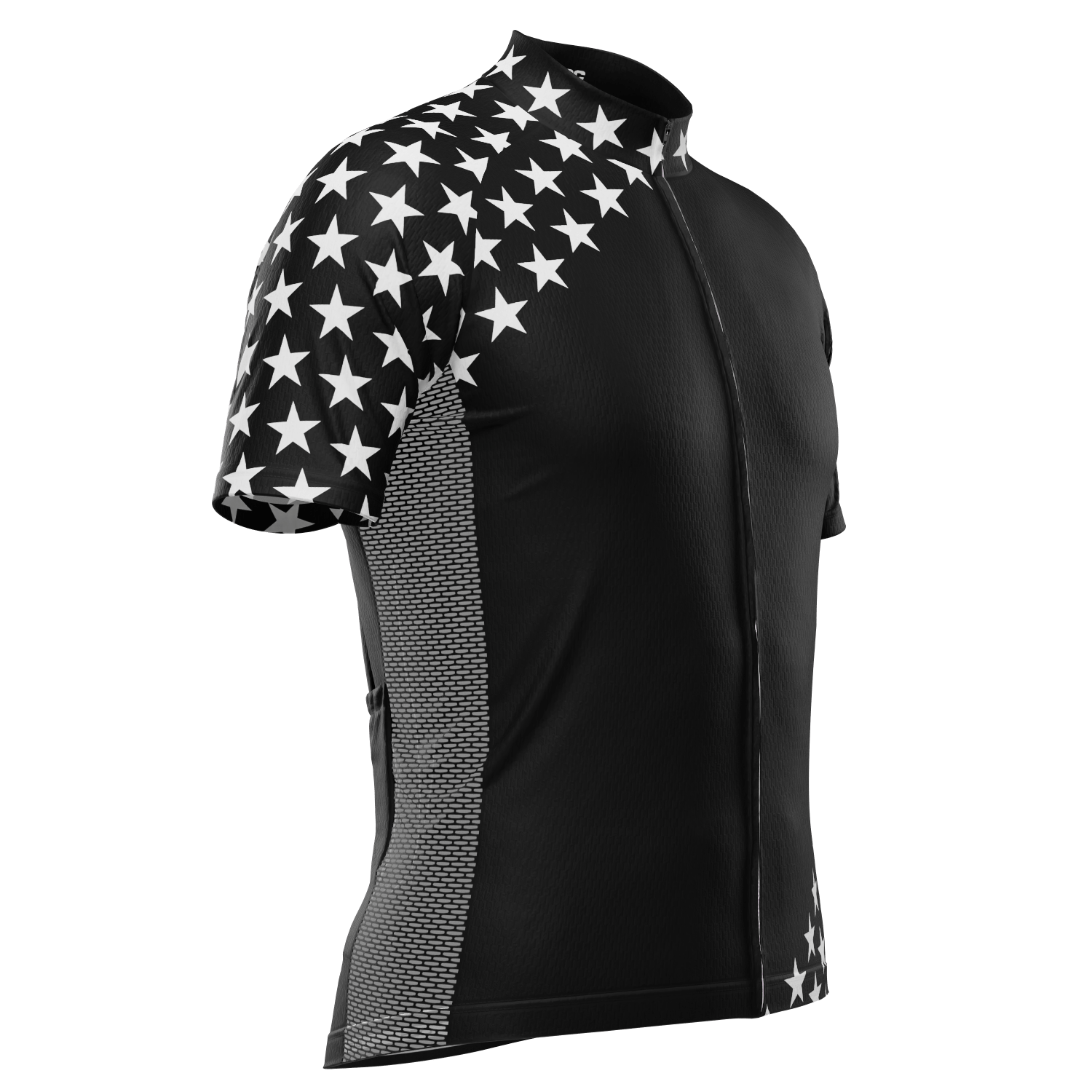 The Men's Starred Short Sleeve Cycling Jersey features a moisture-wicking LEMBO 140 GSM polyester, cooling 110GSM mesh side panels, and reinforced stitched back pockets.