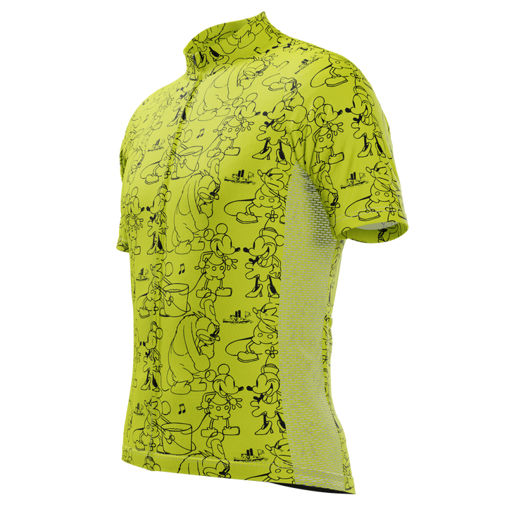 The Men's Steamboat Willie Sketches Short Sleeve Cycling Jersey features a moisture-wicking LEMBO 140 GSM polyester, cooling 110GSM mesh side panels, and reinforced stitched back pockets.