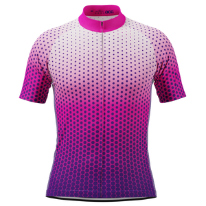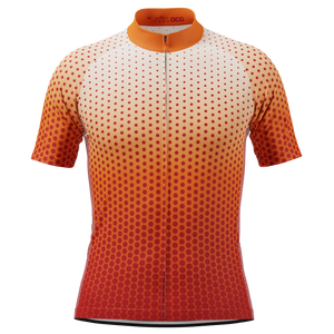 The Men's Stippled Dots Short Sleeve Cycling Jersey features a moisture-wicking LEMBO 140 GSM polyester, cooling 110GSM mesh side panels, and reinforced stitched back pockets.