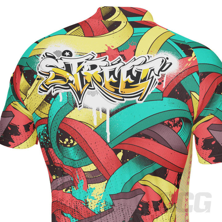The Men's Street Graffiti Short Sleeve Cycling Kit features a moisture-wicking LEMBO 140 GSM polyester jersey body, cooling 110GSM mesh side panels, and reinforced stitched back pockets.