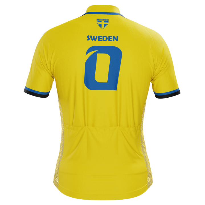 The Men's Sweden Soccer Short Sleeve Cycling Jersey features a moisture-wicking LEMBO 140 GSM polyester, cooling 110GSM mesh side panels, and reinforced stitched back pockets.