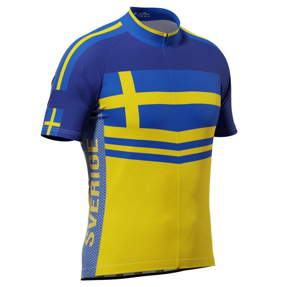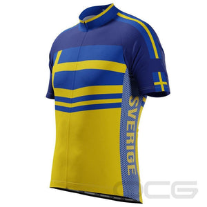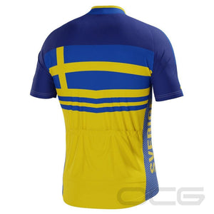 The Men's Sweden Sverige Flag Short Sleeve Cycling Jersey features a moisture-wicking LEMBO 140 GSM polyester, cooling 110GSM mesh side panels, and reinforced stitched back pockets.