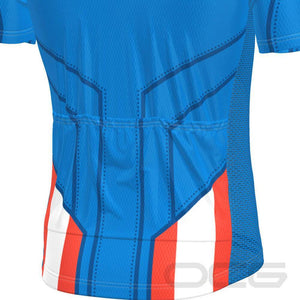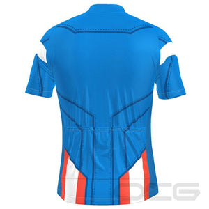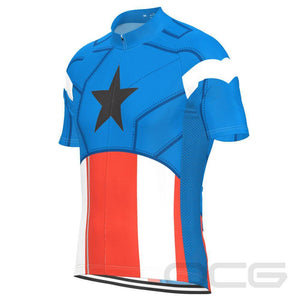 The Men's The Captain USA Flag Cycling Jersey features a moisture-wicking LEMBO 140 GSM polyester, cooling 110GSM mesh side panels, and reinforced stitched back pockets.