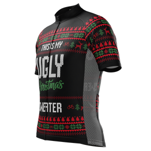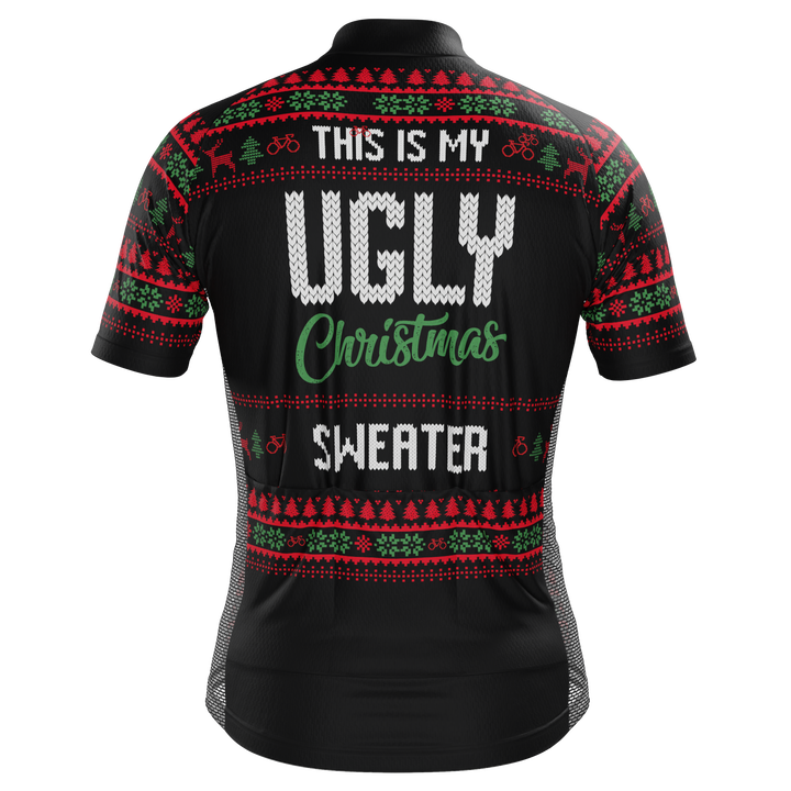 The Men's This is my Ugly Christmas Sweater Short Sleeve Cycling Jersey features a moisture-wicking LEMBO 140 GSM polyester, cooling 110GSM mesh side panels, and reinforced stitched back pockets.
