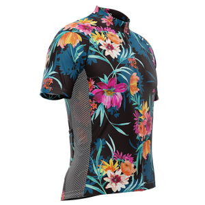 The Men's Tropical Bloom Short Sleeve Cycling Jersey features a moisture-wicking LEMBO 140 GSM polyester, cooling 110GSM mesh side panels, and reinforced stitched back pockets.