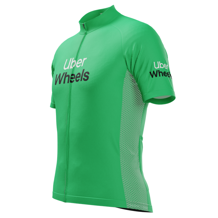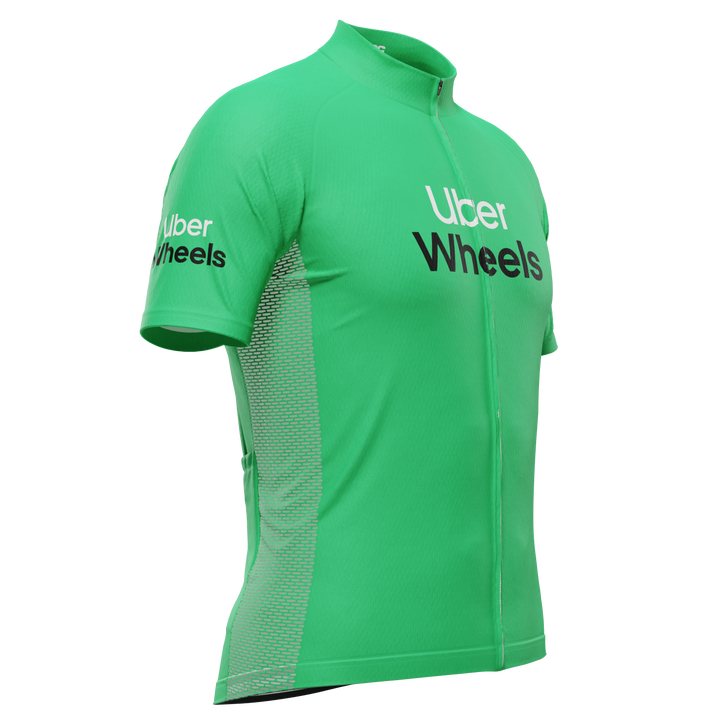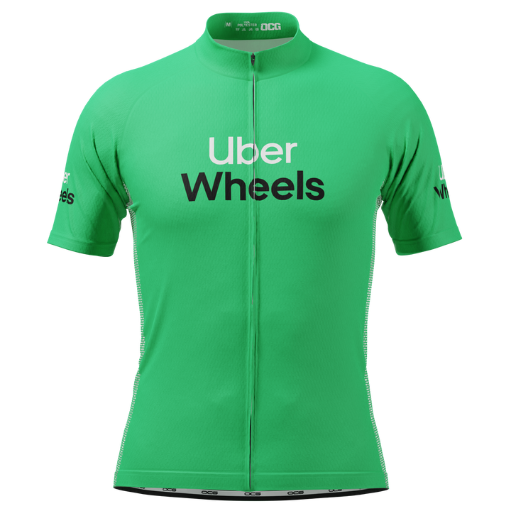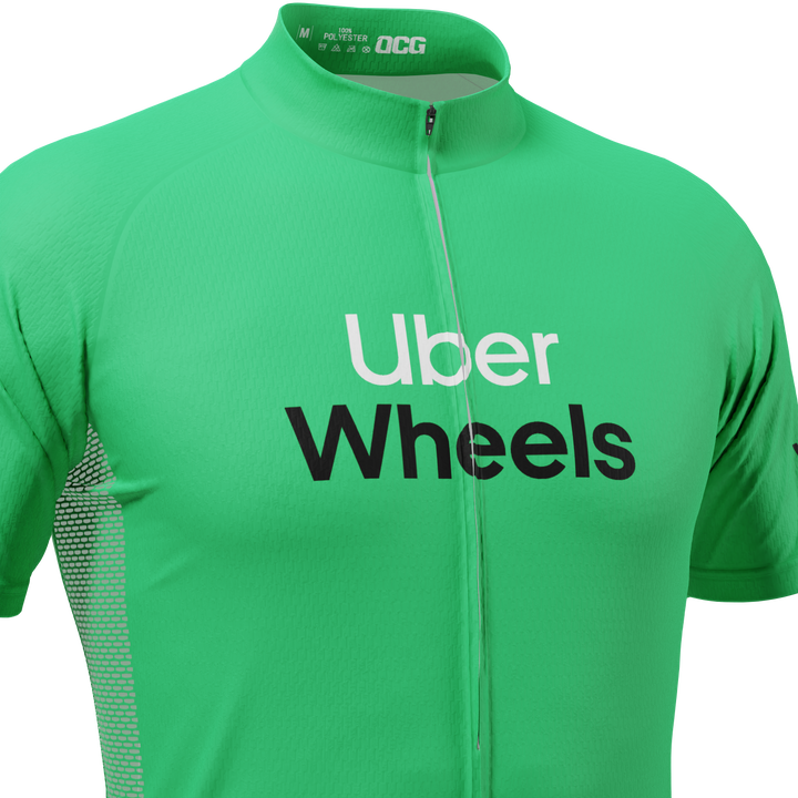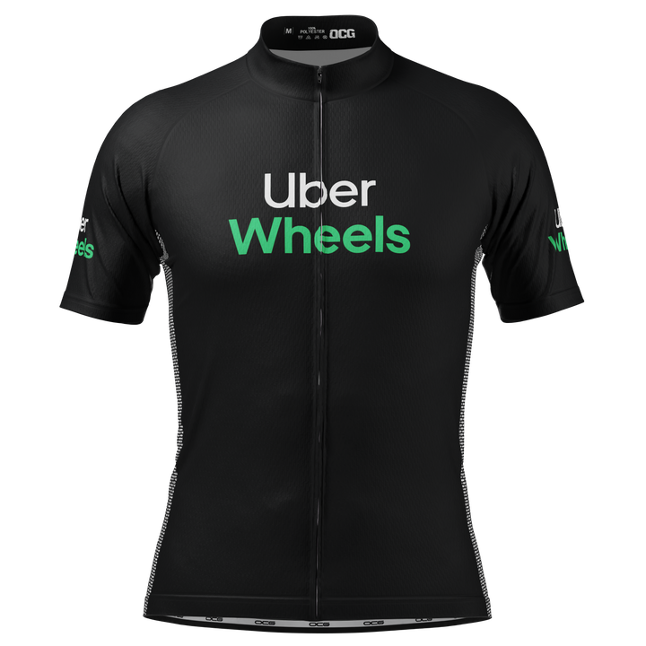 The Men's Uber Wheels Short Sleeve Cycling Jersey features a moisture-wicking LEMBO 140 GSM polyester, cooling 110GSM mesh side panels, and reinforced stitched back pockets.
